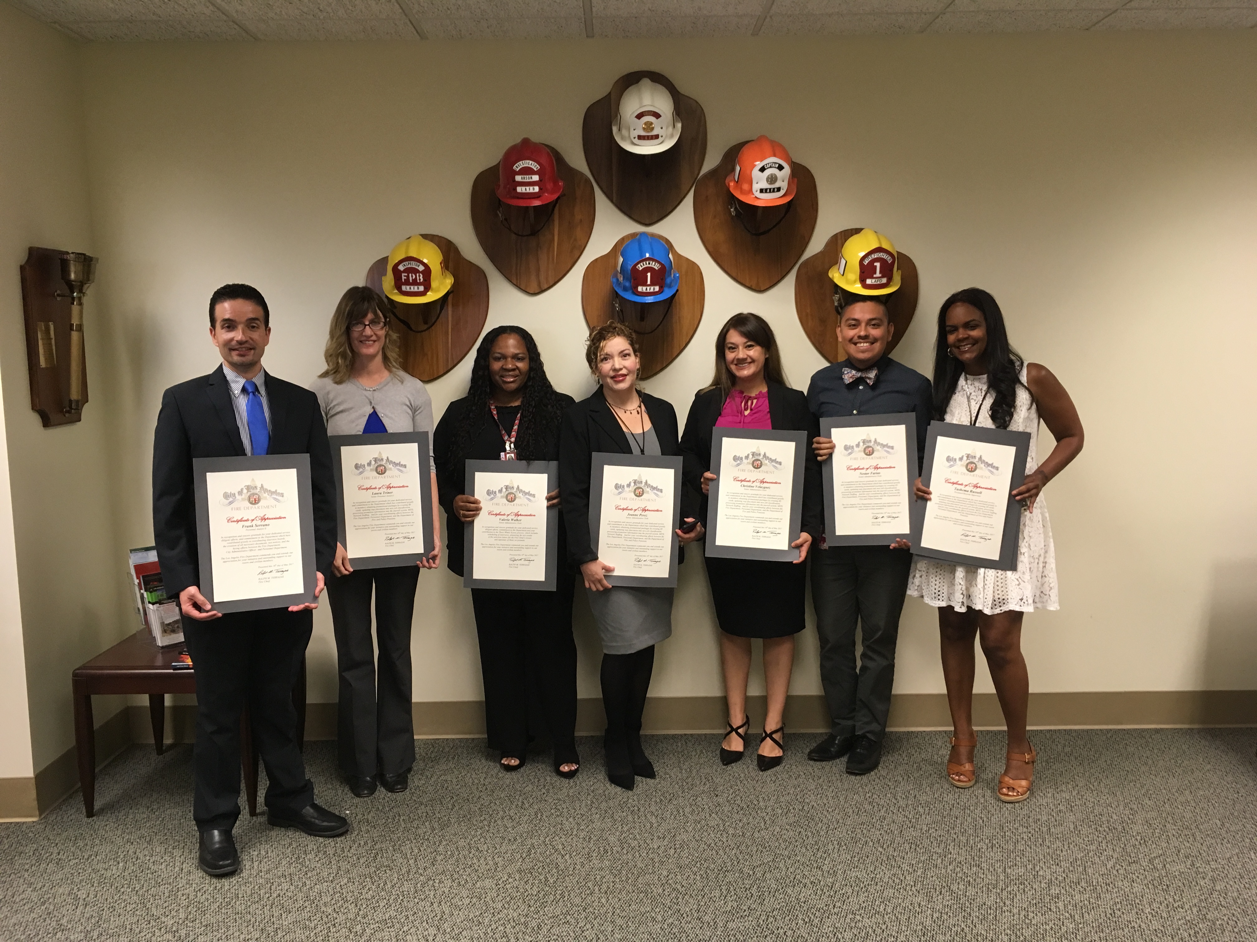 Today, the LAFD along with the Fire Commission proudly honors eight of these members who have made the recent surge of new recruits and the abundance of recent promotions possible. Their dedicated service, diligent efforts, and commitment to the Department have contributed greatly to coordinating the promotional process and hiring efforts between the Fire Department, City Administrative Officer, and Personnel Department.