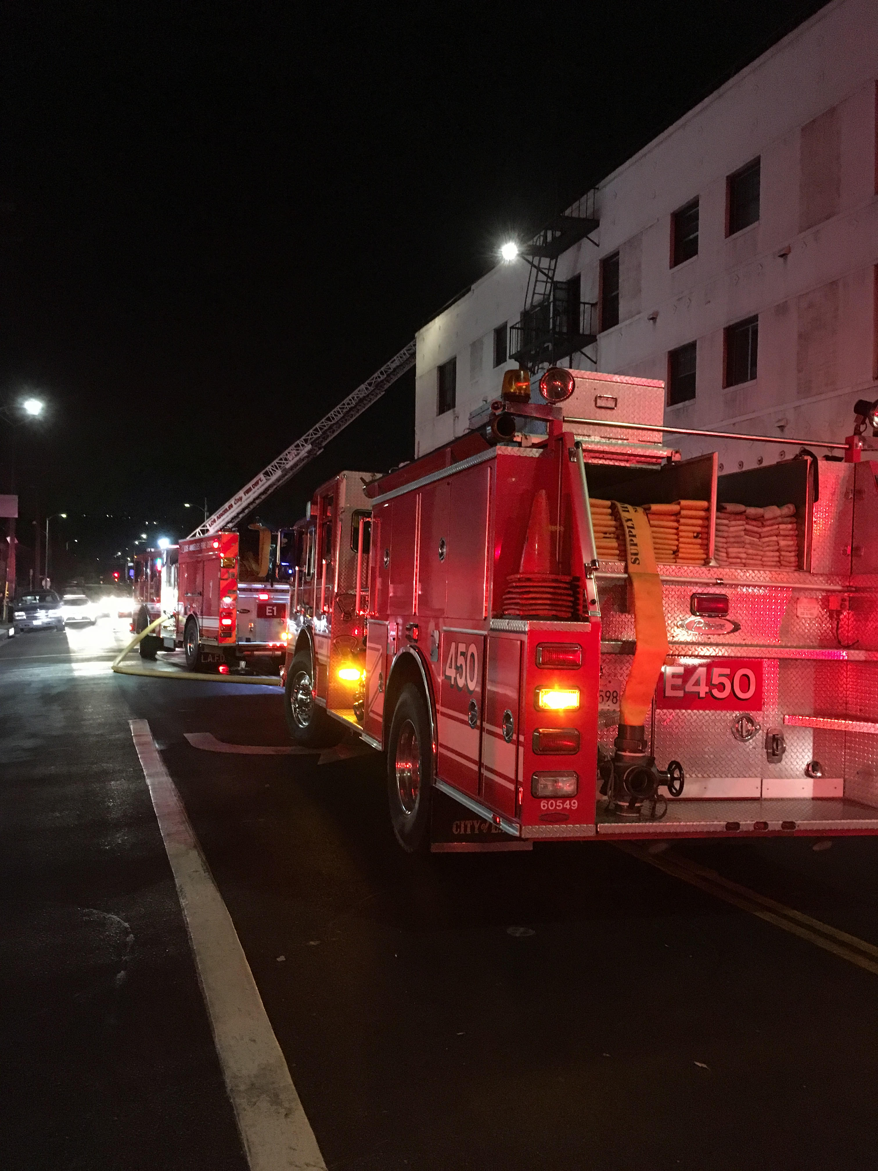 On October 9, 2018, the Los Angeles Fire Department was notified at 8:41 PM of a structure fire at 2532 North Daly Street in Lincoln Heights. Firefighters arrived to find flames inside one unit on the second floor of a three-story center hallway apartment building.