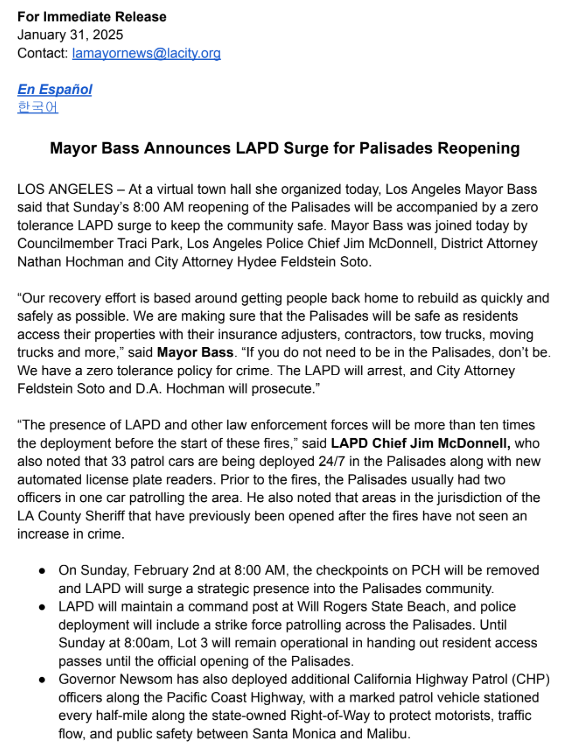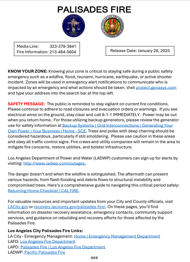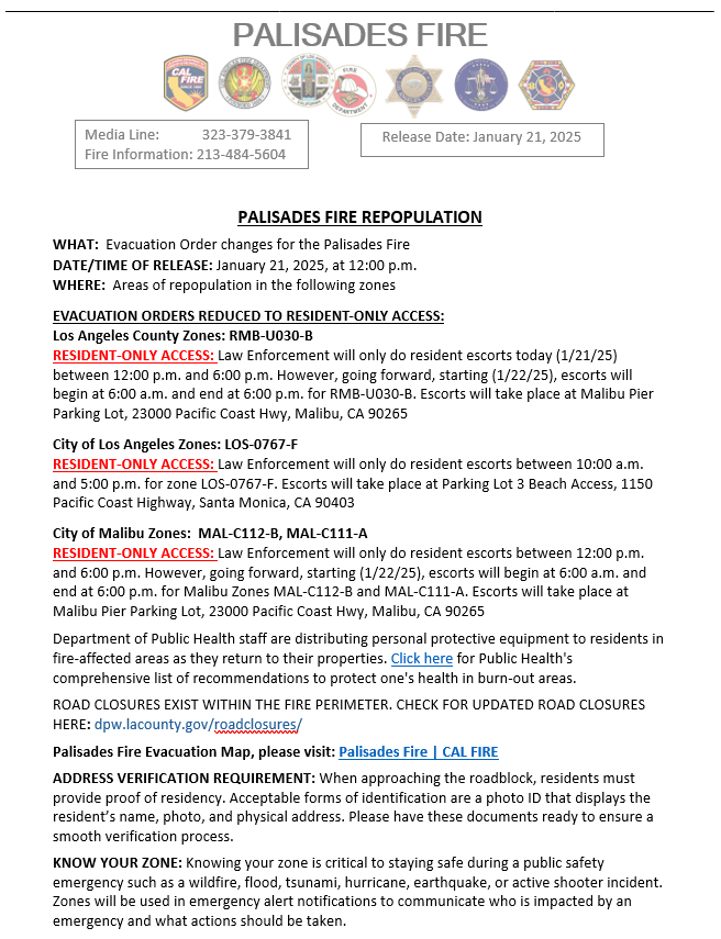 All residents in the Pacific Palisades can now access their properties. See more information on reentry guidance including knowing the risks and ways to keep safe on the City’s lacity.gov website.