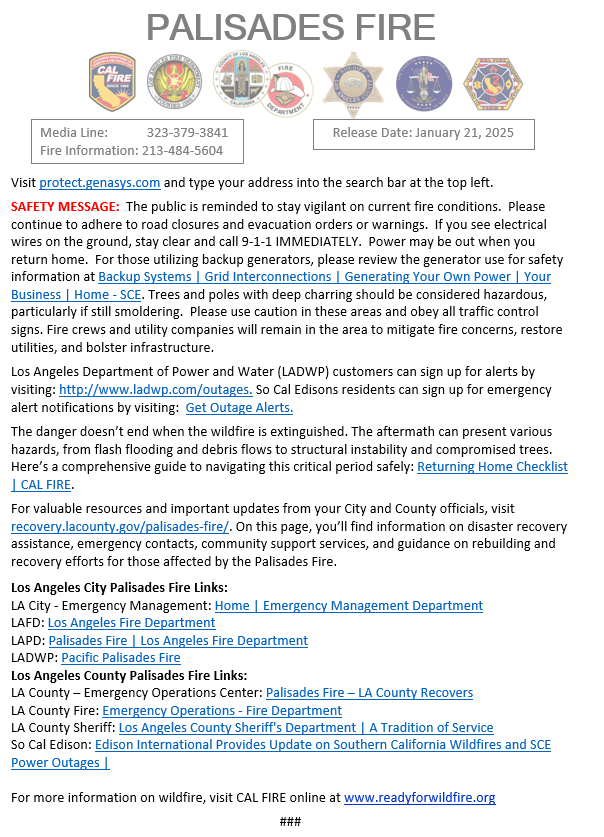 If you have been allowed to return to your home and find your power out but your immediate neighbors’ electricity is on, please check your electrical panel. If your power is still out or the power remains out on your street or block, please contact 1-800-DIAL DWP to report the outage. It may be that LADWP crews are still inspecting the power lines that supply power to your street or block to ensure they are safe to restore. Performing the inspections and repairs enables crews to quickly and safely restore power to affected customers once Palisades Fire Unified Command lifts fire holds that are in place on certain power lines, for safety purposes. LADWP remains in close coordination with Unified Command and will continue working to restore power to customers, as clearance is received.