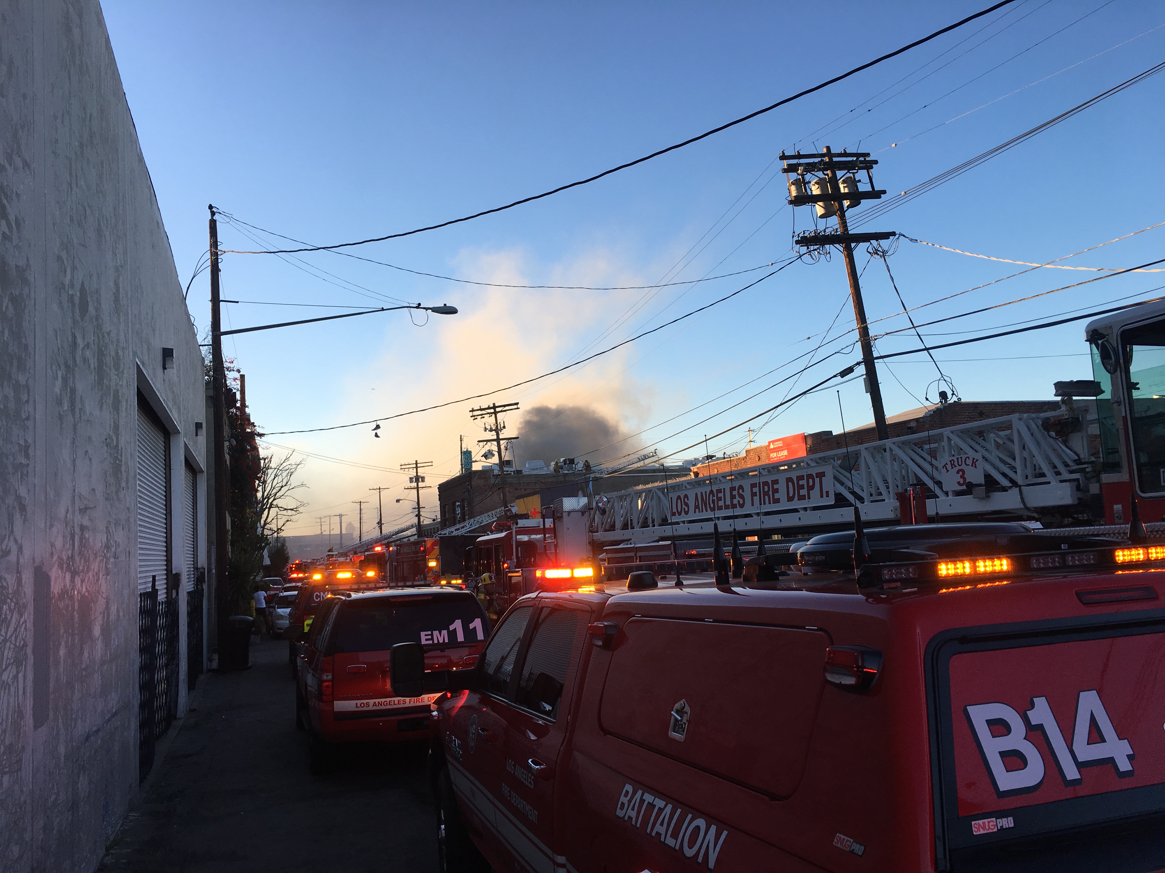 At 6:45AM, the Los Angeles Fire Department responded to a reported structure fire at 459 S Hewitt Street in Downtown Los Angeles. Firefighters arrived to find smoke showing from the roof of the Urth Caffe and immediately initiated an offensive attack while requesting additional units.