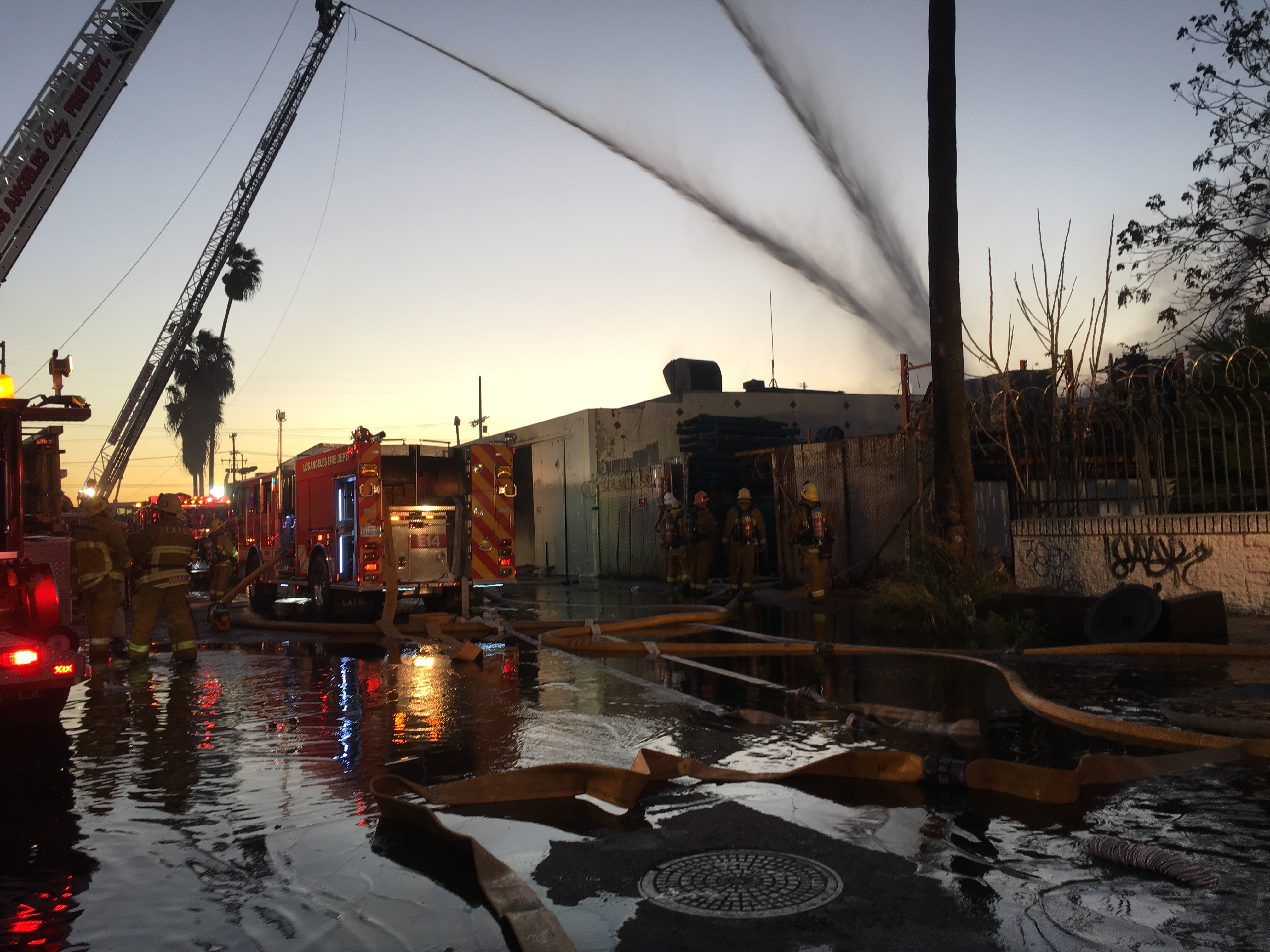 On December 28th, at 5:30AM the Los Angeles Fire Department (LAFD) responded to a reported structure fire at 1842 E 41st Place in Central-Alameda. Firefighters arrived to find heavy fire already burning through the roof, immediately forcing a defensive operation. Crews worked quickly to get multiple ladder pipes flowing water while forcible entry opened up the structure to allow hand line access to the blaze.