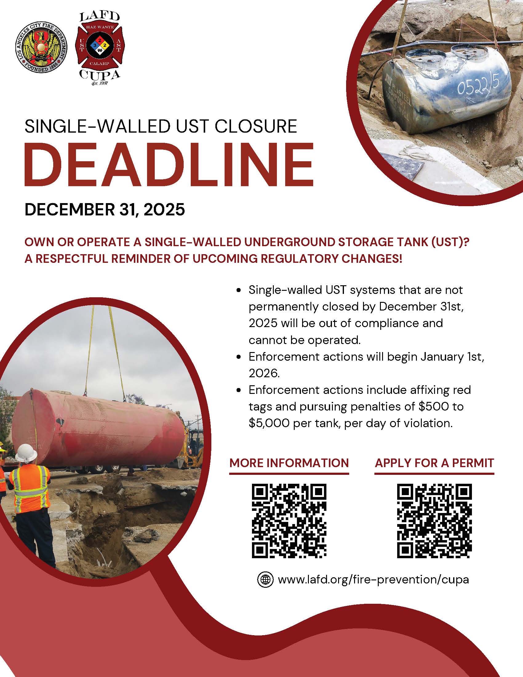 All regulated USTs that do not meet the requirements of H&SC, section 25291(a)(1)-(6), must be permanently closed on or before December 31, 2025 in accordance with H&SC, section 25298, and the California Code of Regulations, title 23, chapter 16 (UST Regulations), section 2672. A single-walled UST is either the tank and/or the connected piping which do not have secondary containment and a continuous leak detection system meeting the requirements of H&SC, section 25291(a)(1)-(6). UST Systems which do not have secondary containment and a continuous leak detection system that have not been permanently closed by the regulatory due date are out of compliance, cannot be operated, and will be red tagged by the Unified Program Agency (UPA) or the State Water Resources Control Board (State Water Board), preventing fuel deliveries and dispensing. Penalties for systems out of compliance are $500 to $5,000 per day per underground storage tank.