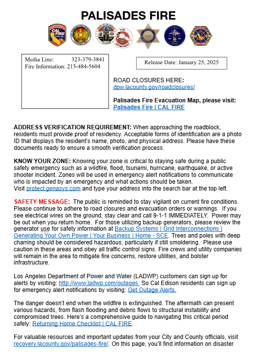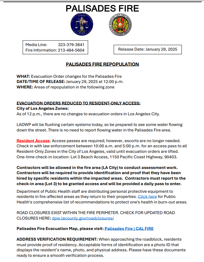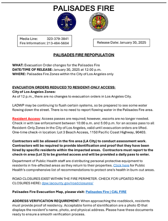 All residents in the Pacific Palisades can now access their properties. See more information on reentry guidance including knowing the risks and ways to keep safe on the City’s lacity.gov website.