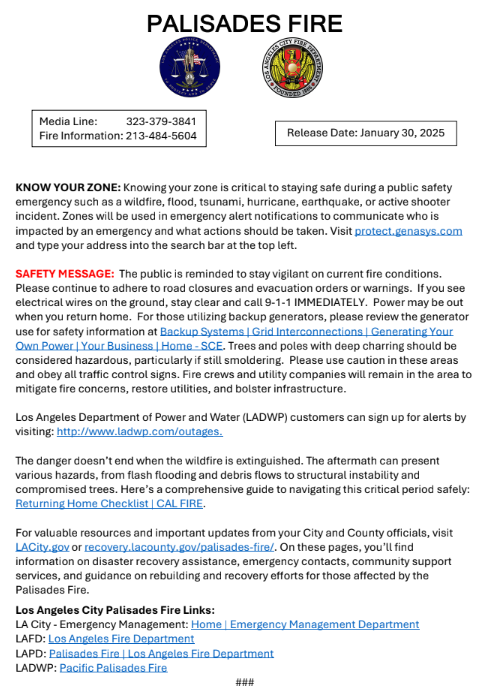If you have been allowed to return to your home and find your power out but your immediate neighbors’ electricity is on, please check your electrical panel. If your power is still out or the power remains out on your street or block, please contact 1-800-DIAL DWP to report the outage. It may be that LADWP crews are still inspecting the power lines that supply power to your street or block to ensure they are safe to restore. Performing the inspections and repairs enables crews to quickly and safely restore power to affected customers once Palisades Fire Unified Command lifts fire holds that are in place on certain power lines, for safety purposes. LADWP remains in close coordination with Unified Command and will continue working to restore power to customers, as clearance is received.