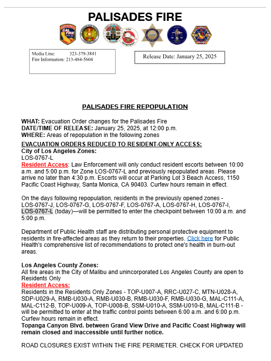 - LOS ANGELES COUNTY ZONES: All Evacuation Orders have been lifted in the City of Malibu and unincorporated Los Angeles County.