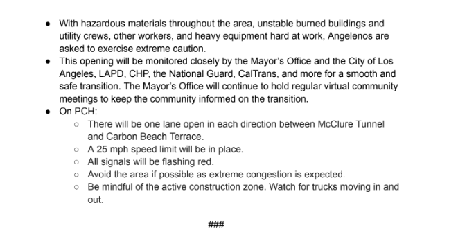 - Pacific Coast Highway is closed from McClure Tunnel in Santa Monica to Topanga Canyon with LAPD managing traffic for evacuations