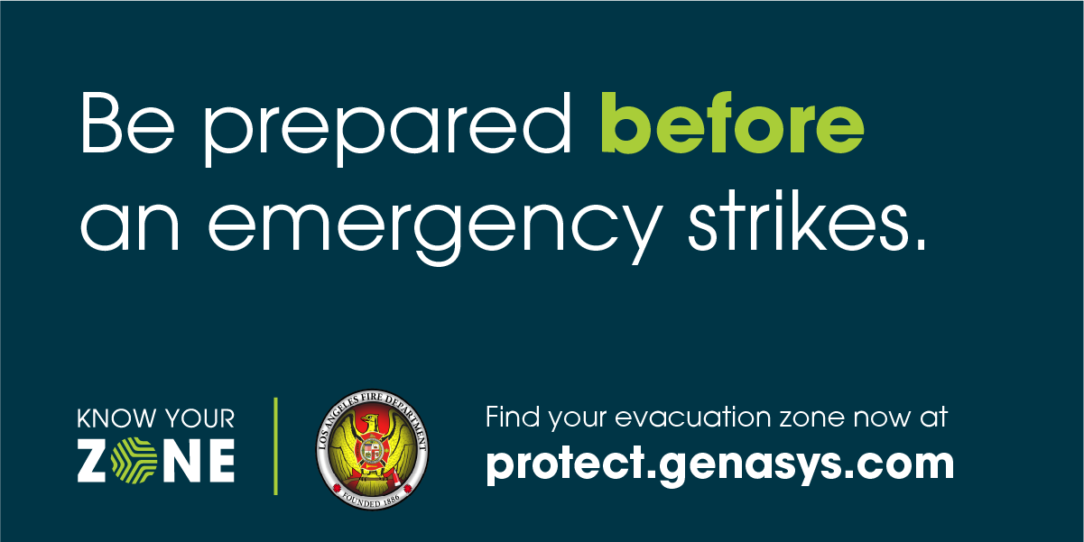 The City of Los Angeles uses the Genasys Protect platform to communicate zone-based evacuation information. Residents can use the free Genasys Protect website or App for iOS or Android to get official evacuation information directly from the City.