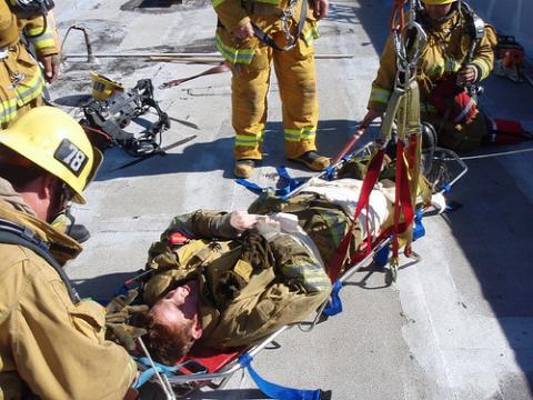 The patient was first evaluated and secured on a backboard to protect against any possible spinal injuries. Fireifghters then placed him inside a 'litter basket' which is used to move patients during a rescue operation. (example of litter basket, picture from training exercise)
